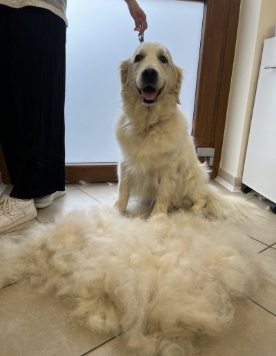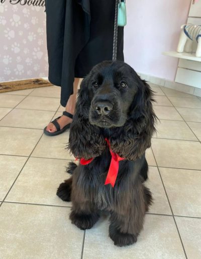 Rifinitura specifica per razza e stile, eseguita con tecniche precise e rispettose del benessere del cane.