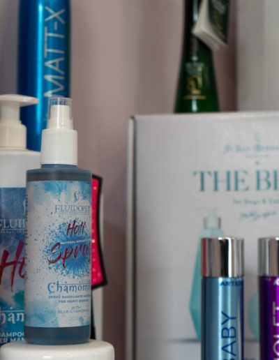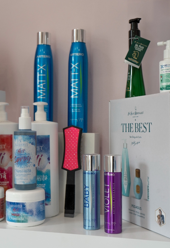 Una toelettatura di qualità inizia con l’utilizzo dei prodotti giusti. Nel nostro centro troverai shampoo, balsami e lozioni specifiche per ogni tipo di pelo, tutti selezionati per garantire il massimo della sicurezza e dell’efficacia. Formulati con ingredienti delicati, aiutano a mantenere la pelle sana, il manto lucido e privo di impurità.